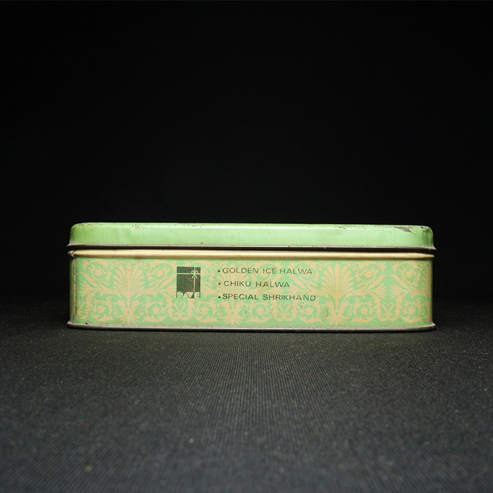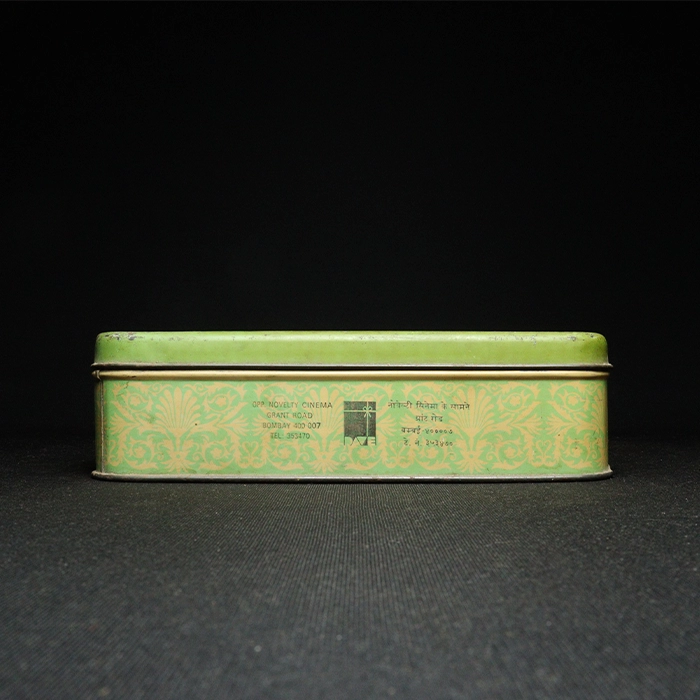 Dave Sweet Mart tin box has a hinged lid. This lid has a slight dent. It originated in the 1980s. The Dave Sweet Mart tin box has an elegant print of Lord Ram and Sita on the lid. On the sides of the tin box there is some information about the mart-like types of sweets, brand name in Hindi, address of the shop and again the brand name in English. The overall condition of the box is Good. It originated in Bombay(Mumbai), India.