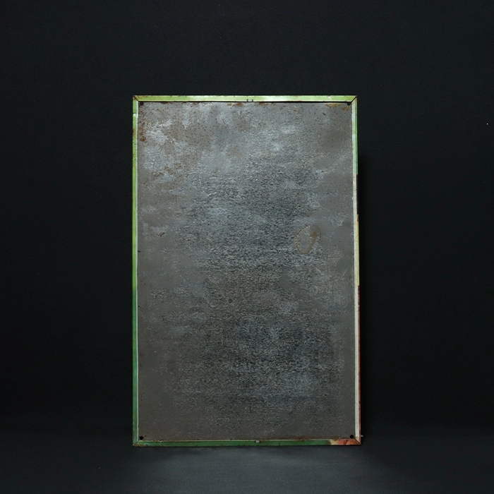 This signboard is vintage and will have some wear from years of use. The exterior has no serious defects. The metal has an aged, slightly mottled brown patina. The paint is starting to fade and wear away in places, especially on the edges and corners. The metal retains its original shape with only one bend at the top left. The condition is excellent.