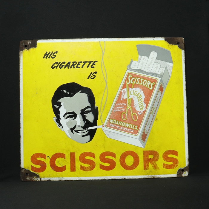 This is a vintage porcelain enamel signboard that features a scissors cigarette box. The signboard has the face of a man smoking the brand’s cigarette. The lithograph on the signboard says, “His cigarette is SCISSORS.” All four corners are showing paint loss, with some surface rust on all four corners. For its age, it is in good condition. This sign was made in the UK.
