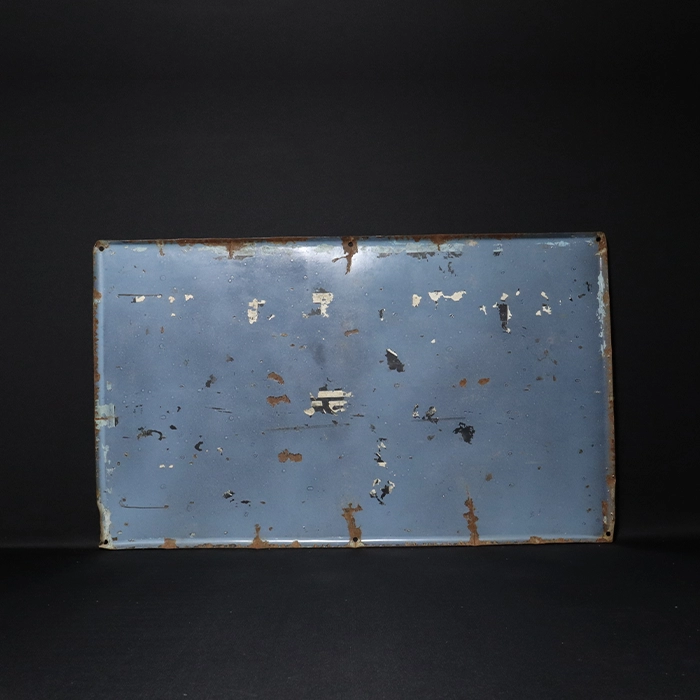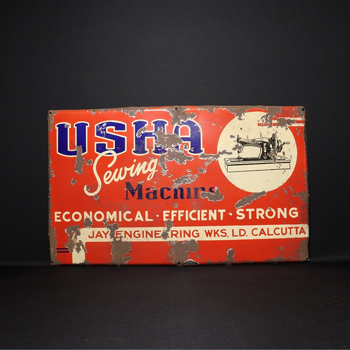 A vintage “Usha” porcelain enamel signboard from 1950. The signboard has an advertisement for a sewing machine. This sign was made in India and is in good condition overall without dents. There are numerous paint chips all over the signboard. Despite being 70 years old and having been stored outside for many years, it still presents very well.
